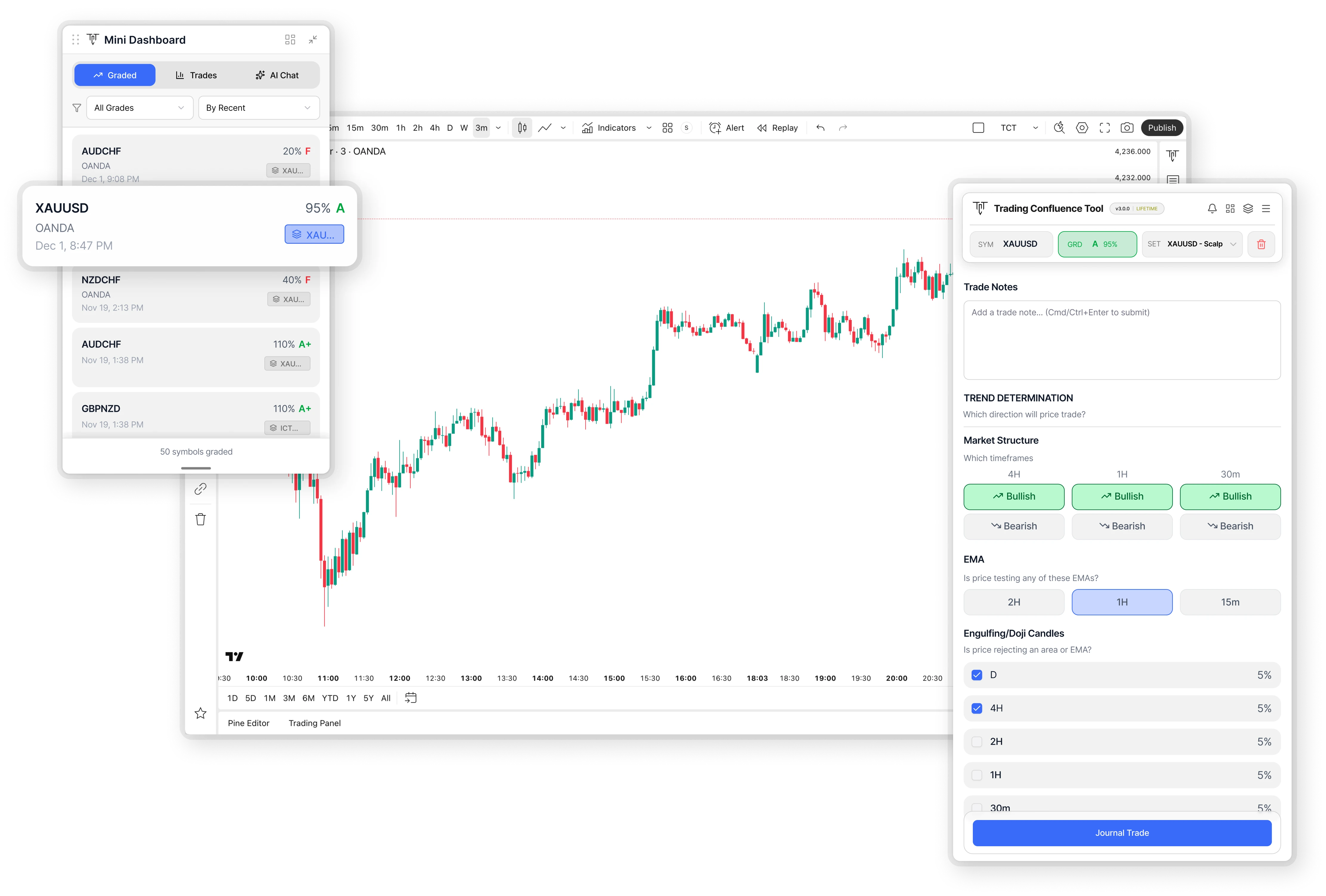 Watch as the tool analyzes your TradingView chart in real-time, evaluating confluences to deliver instant A+ through F grades.